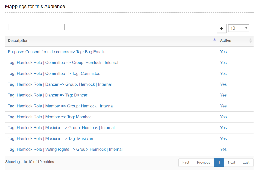 At the moment, we only communicate internally with people in the morris side itself, but having an “Internal” group in MailChimp gives us the option to create a newsletter if we ever become world-famous, at which point we would create another group that the public can select themselves into. Any of the “Hemlock Role” tags shown in the image above would denote a person as being part of the side, therefore all of them will map to the “Internal” group. Each tag represent roles within the side, and will help us to segment our mailings from MailChimp. The “Bag Emails” purpose in Donorfy is always assessed within the list criteria to determine whether we have permission to email people. In practice, everybody has opted in, but this gives people the choice to opt out if they choose to.