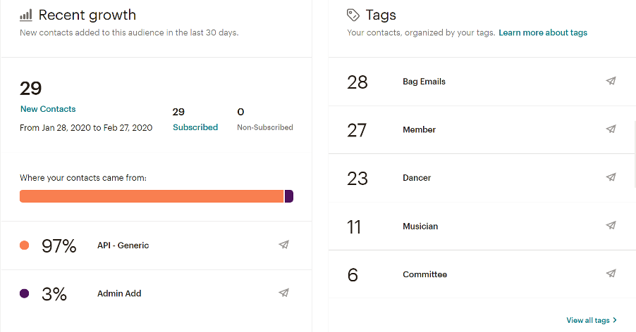 Thus, my morris dancing side became the perfect excuse to get set up again on Donorfy Essentials. This time, we incorporated the MailChimp integration (also free to sign up and integrate) by following the Donorfy knowledge base articles. Now we can communicate separately with our dancers, our musicians and we can also email all our members. I have a small set of people to work with, and I know them personally, so I can tell at a glance that my segmented emails have gone to the correct people.